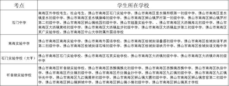 为做好疫情防控工作,同时方便考生就近参加综合评价,今年设置石门中学、南海实验中学、石门实验学校(太平)和听音湖实验学校(西樵)四个考点。考生考试场地主要按初中毕业学校编排,其中南海区外的所有考生安排在石门中学考点。请考生务必根据初中毕业学校准确到达相应考点(详见下表)。