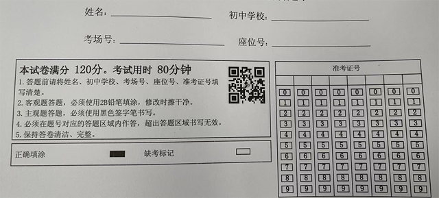 考生“答题卡”上的信息(准考证号、考场号和座位号)见准入证。特别提醒:答题卡上的“准考证号”不是中考的准考证号,而是我校自编的准入证号(必须准确填涂)。