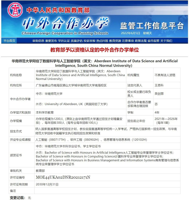 华南师范大学阿伯丁数据科学与人工智能学院(以下简称“阿伯丁学院”) 是华南师范大学与英国阿伯丁大学整合双方优势资源,合作共建的非独立法人中外合作办学机构。阿伯丁学院于2021年5月正式获得教育部批复设立,办学许可证编号MOE44UKA02DNR20212171N。
