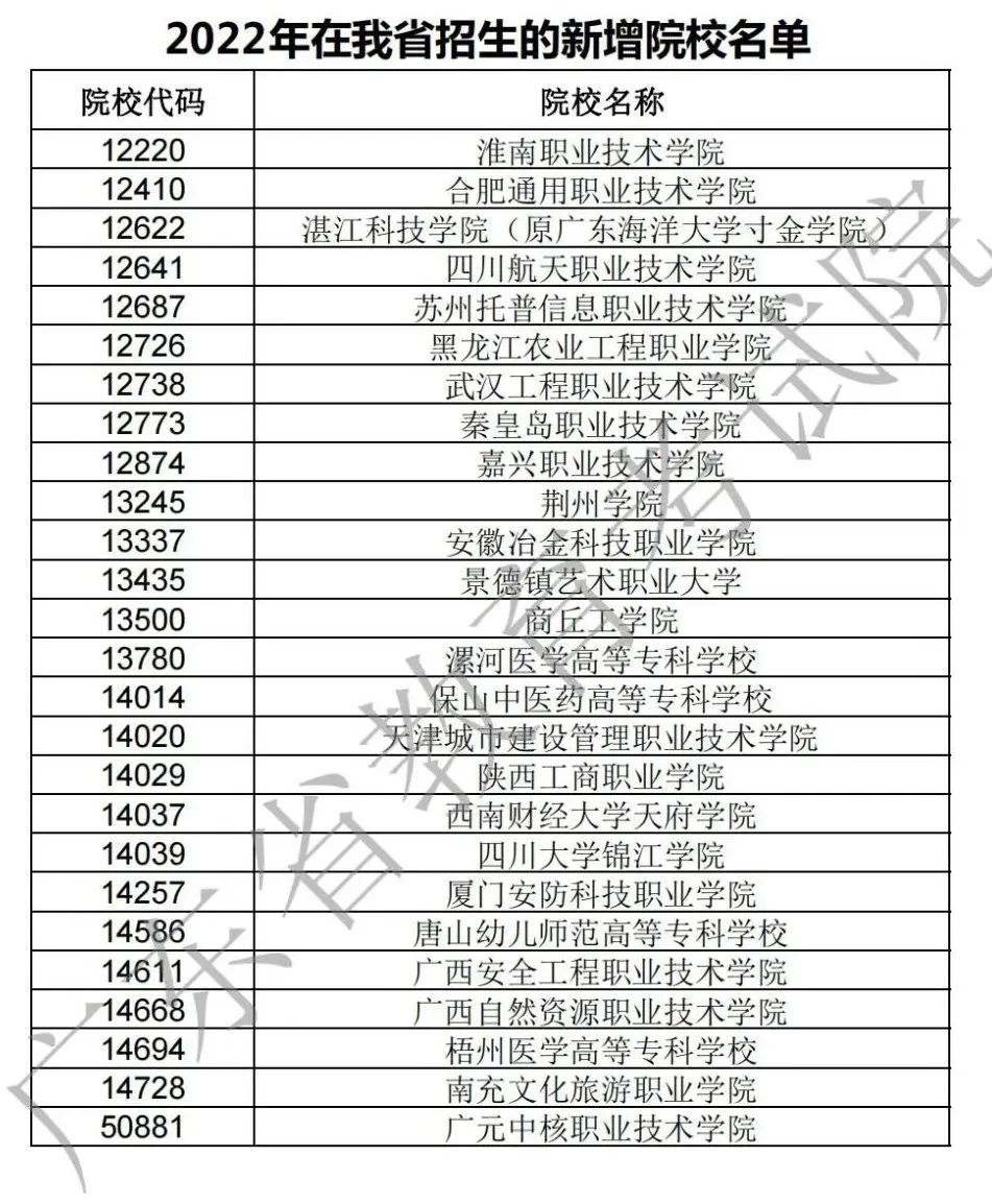 广东省2022年新增54所院校招生