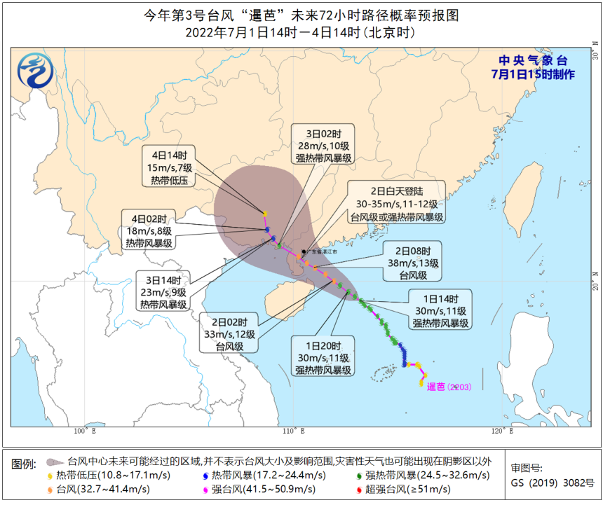 佛山气象台2022年7月1日发布消息,今年第3号台风“暹芭”于6月30日23时加强为强热带风暴级,预计其将以15到20公里的时速向西北方向移动,强度继续加强,并将于2日白天在阳江到徐闻之间沿海地区登陆。7月1日14时,“暹芭”(强热带风暴级)位于距离佛山市偏南方向约430公里的南海海面上,中心附近最大风力11级(30米/秒)。