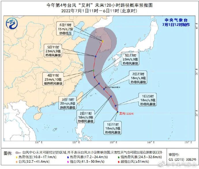 据中央气象台消息,台风“艾利”于7月1日上午11时生成,中心位于日本冲绳县那霸市南偏东方向约750公里的洋面上,北纬20.3度、东经131.1度,中心附近最大风力有8级(18 米/秒),中心最低气压998百帕,七级风圈半径100-150公里。