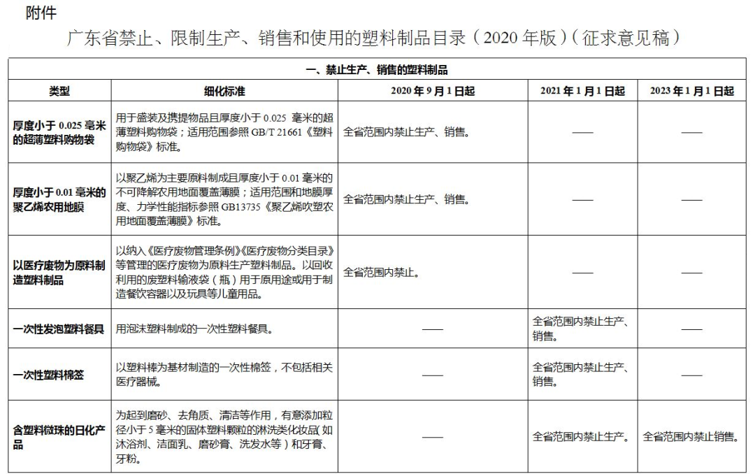 为便于各地执行《省实施意见》,省发展改革委、省生态环境厅制定了《广东省禁止、限制生产、销售和使用的塑料制品目录(2020年版)》,明确了相关禁限细化标准、区域范围和时间节点。如厚度小于0.025毫米的超薄塑料购物袋、厚度小于0.01毫米的聚乙烯农用地膜,从今年9月1日起,全省范围禁止生产、销售。而一次性发泡塑料餐具、一次性塑料棉签,从2021年1月1日起,全省范围禁止生产、销售。