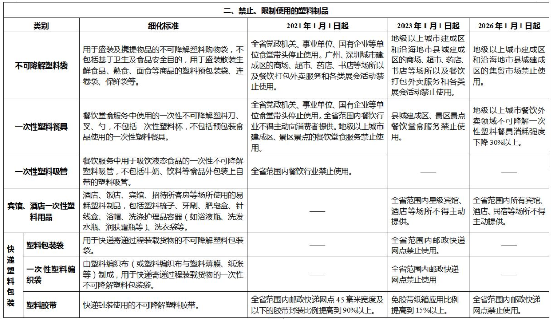 还明确分区域禁限。2021年1月1日起,广州、深圳城市建成区的商场、超市、药店、书店等场所以及餐饮打包外卖服务和各类展会活动,率先禁止使用不可降解塑料袋。而从2023年1月1日起,扩大到地级以上城市建成区和沿海地市县城建成区的商场、超市、药店、书店等场所以及餐饮打包外卖服务和各类展会活动禁止使用。